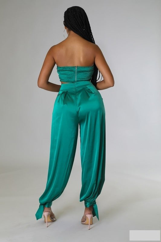- Pants: High-waisted satin pants with cuffed bottoms, a tailored look, and zipper closure for a polished finish.